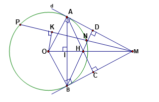 Bài 3: Cho đường tròn (O; R), từ một điểm A trên (O) kẻ tiếp tuyến d với (O). Trên đường thẳng d lấy điểm M bất kì ( M khác A) kẻ cát tuyến MNP và gọi K là trung điểm của NP, kẻ tiếp tuyến MB (B là tiếp điểm). Kẻ AC ⊥ MB, BD ⊥ MA, gọi H là giao điểm của AC và BD, I là giao điểm của OM và AB.