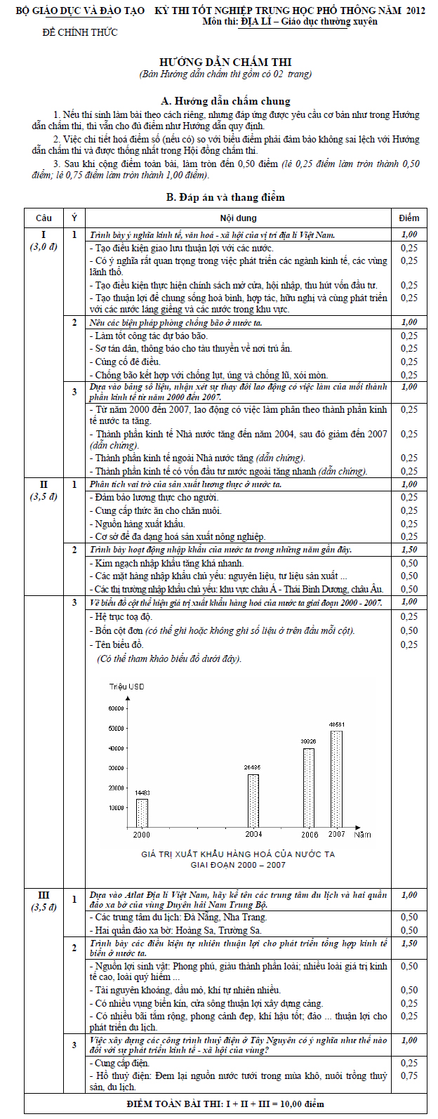 Bản hướng dẫn chấm thi tốt nghiệp THPT môn Địa lí hệ Giáo dục thường xuyên 2012