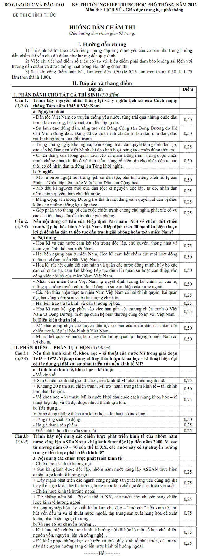 Bản hướng dẫn chấm thi tốt nghiệp THPT môn Lịch sử hệ Phổ thông năm 2012