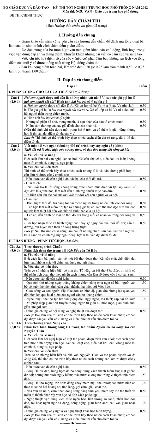 Bản hướng dẫn chấm thi tốt nghiệp THPT môn Ngữ văn hệ Giáo dục trung học phổ thông năm 2012