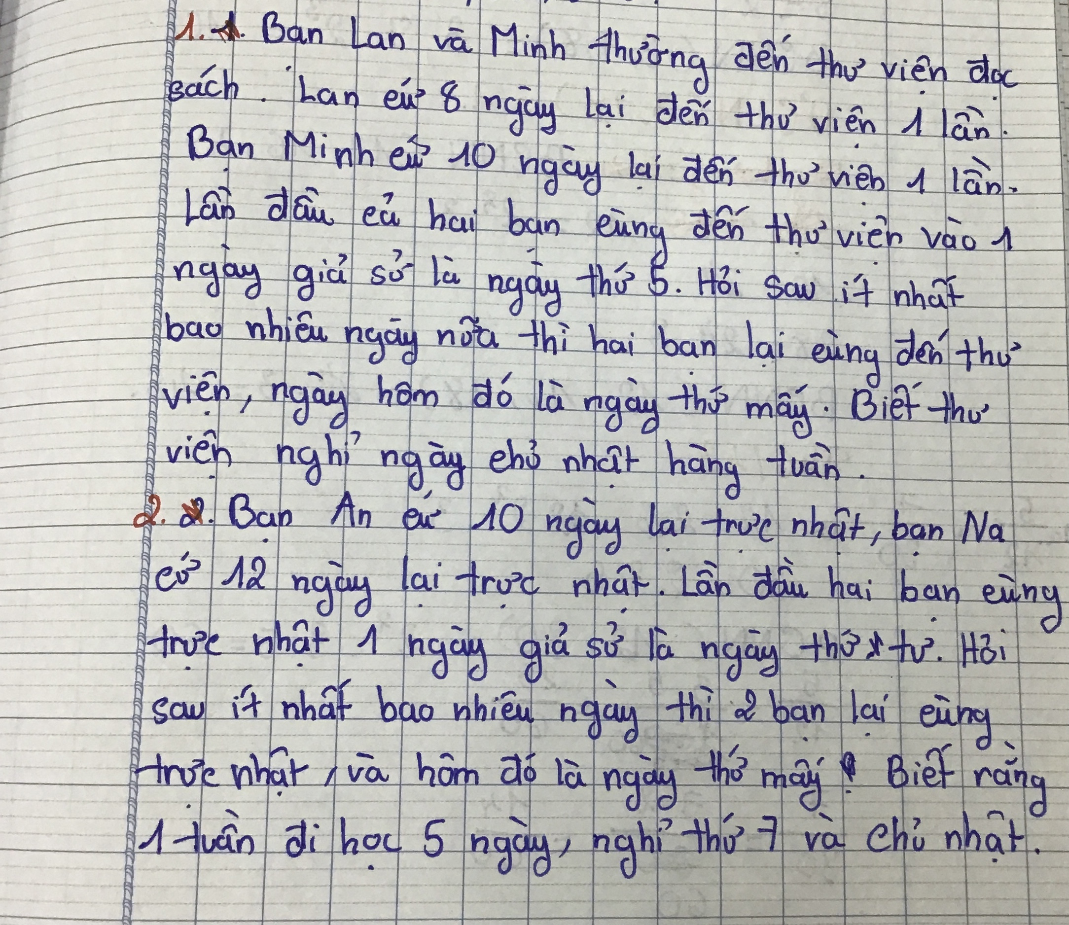 Bạn Lan và bạn Minh thường đến thư viện đọc sách. Lan cứ 8 ngày lại đến thư viện 1 lần