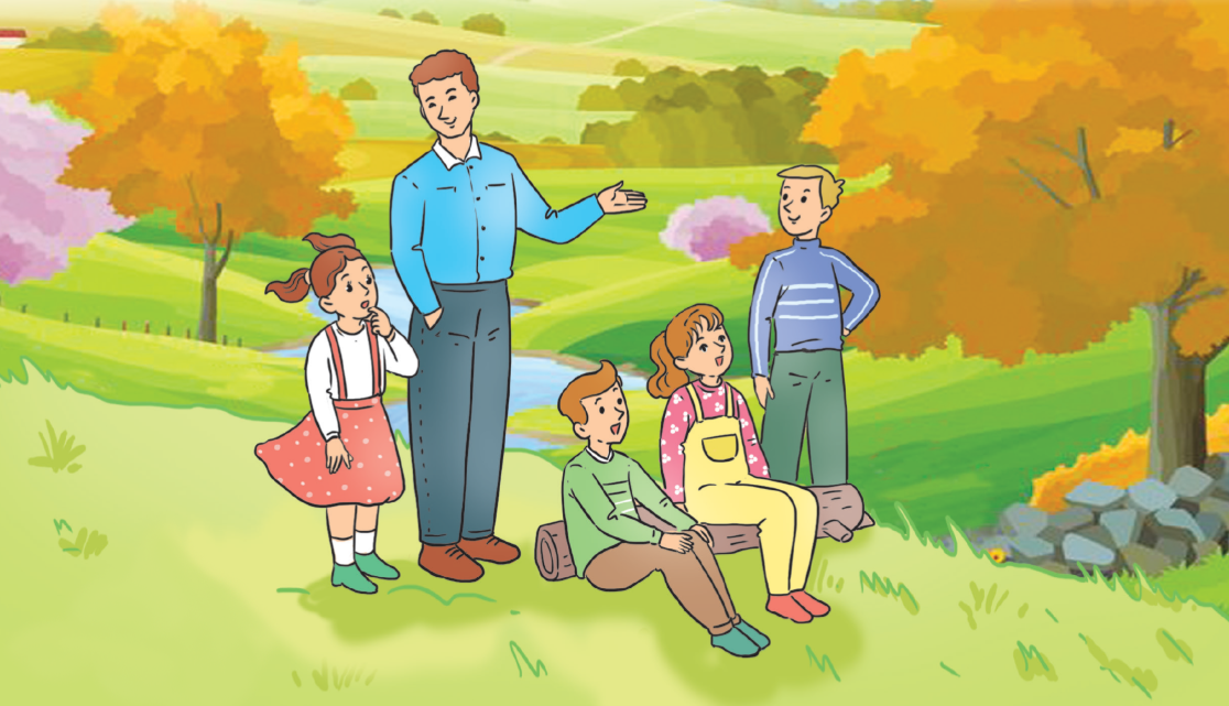 Cuộc trò chuyện của thầy giáo và các bạn học sinh diễn ra ở: cánh đồng vào một buổi sáng tháng Chín mát mẻ và dễ chịu