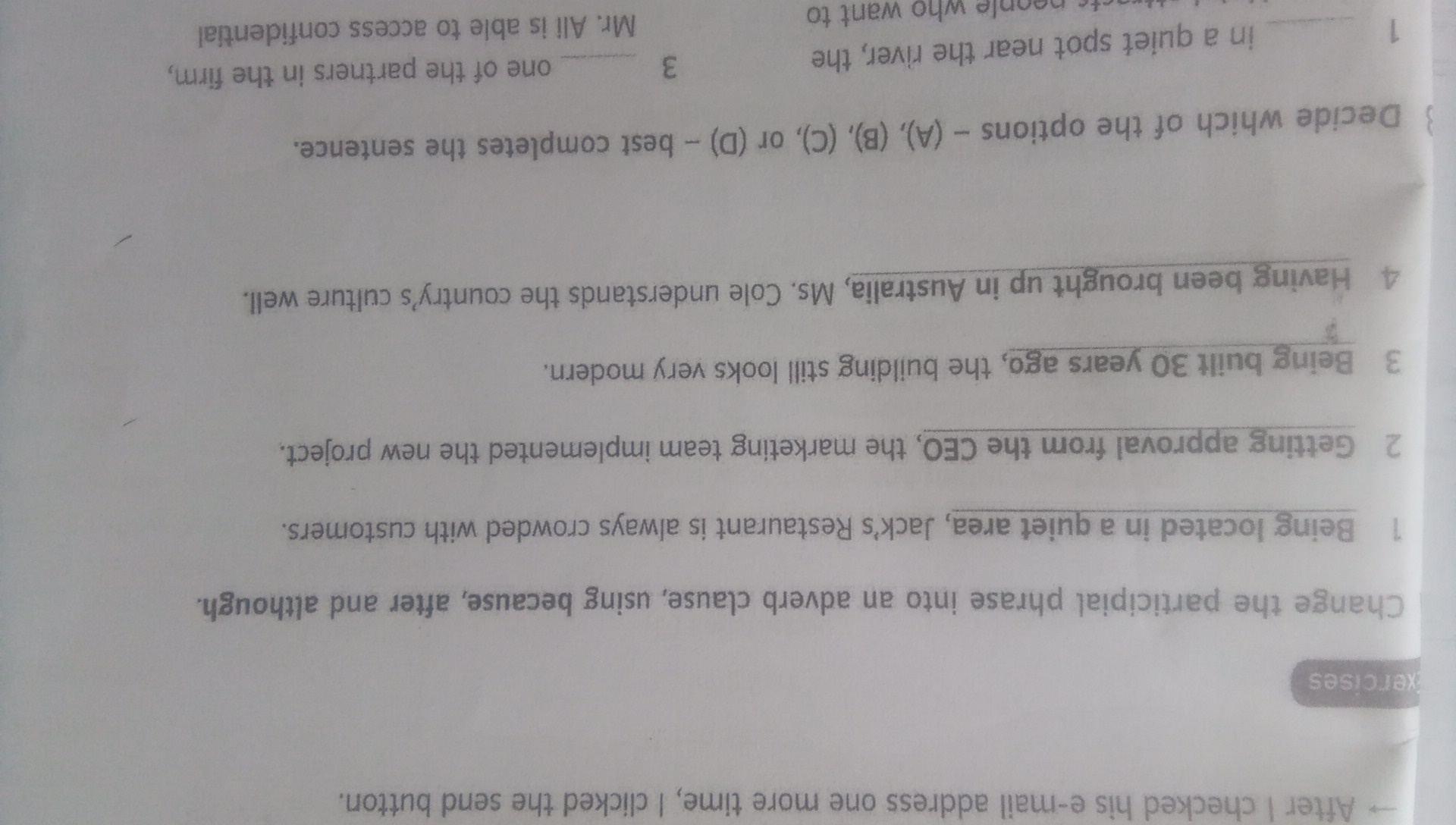 Change the participle phrase into an adverb clause, using because, after, and although