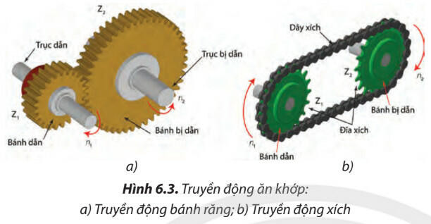 - Bánh răng hoặc đĩa xích truyền chuyển động cho nhau (Hình 6.3 minh họa)