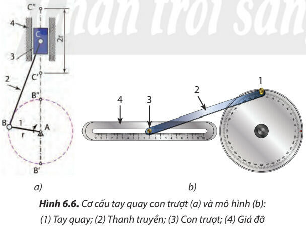 Cơ cấu tay quay con trượt gồm tay quay 1, thanh truyền 2, con trượt 3 và giá đỡ 4.
