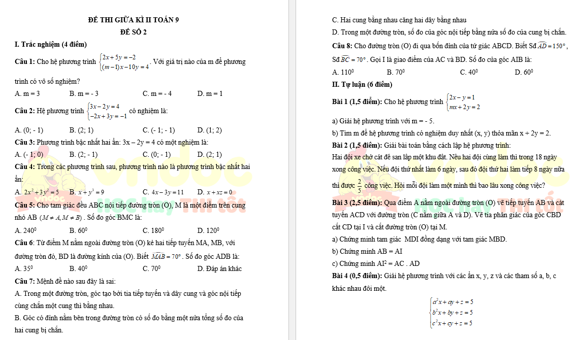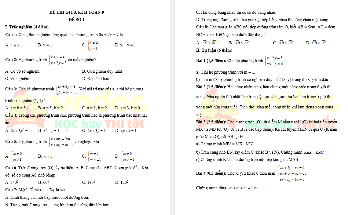 Bộ 5 đề thi giữa kì 2 lớp 9 môn Toán được VnDoc chia sẻ đến các quý thầy cô cùng các bạn học sinh, bộ đề thi gồm có 5 đề thi kèm theo đáp án chi tiết giúp các bạn luyện tập tại nhà, cũng là tài liệu ôn tập giữa kì 2 rất tốt giúp các bạn củng cố kiến thức Toán lớp 9, biết cách phân bổ thời gian thi hợp lý. Đồng thời cũng là tài liệu hay giúp quý thầy cô tham khảo chuẩn bị đề thi. Mời các quý thầy cô cùng các bạn tải về để tham khảo.