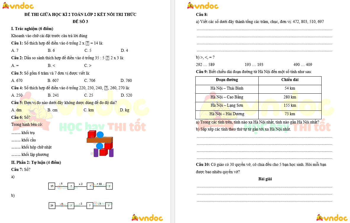 Bộ đề thi Toán lớp 2 giữa kì 2 Kết nối tri thức do VnDoc biên soạn gồm 5 đề thuộc bộ sách Kết nối tri thức có kèm theo đáp án. Bộ đề thi là tài liệu tham khảo giúp các em học sinh lớp 2 ôn tập kiến thức và củng cố các dạng bài tập Toán nửa đầu học kì 2. Hi vọng tài liệu này giúp các em học sinh tự ôn tập và vận dụng các kiến thức đã học vào việc giải bài tập toán. Bộ đề thi còn là tài liệu tham khảo để các thầy, cô có thêm tư liệu ra đề ôn tập cho các em học sinh.