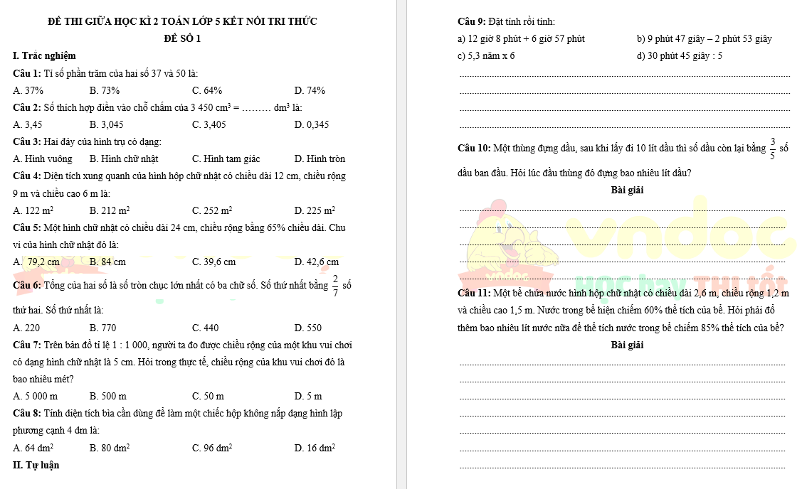 Bộ đề thi giữa học kì 2 Toán lớp 5 Kết nối tri thức gồm 5 đề thi giữa kì 2 có đáp án, được Vndoc biên soạn theo Thông tư 27 dành cho học sinh lớp 5 giúp các em kiểm tra kiến thức hiệu quả và đạt điểm cao trong kì thi giữa kì 2 lớp 5.