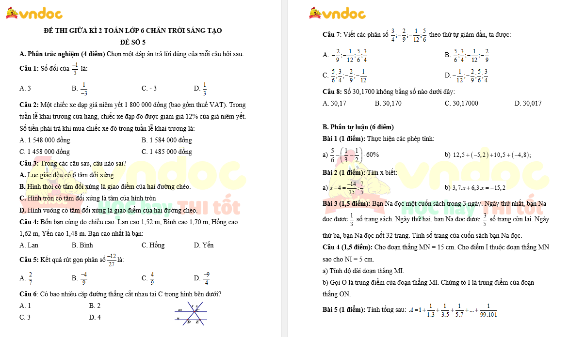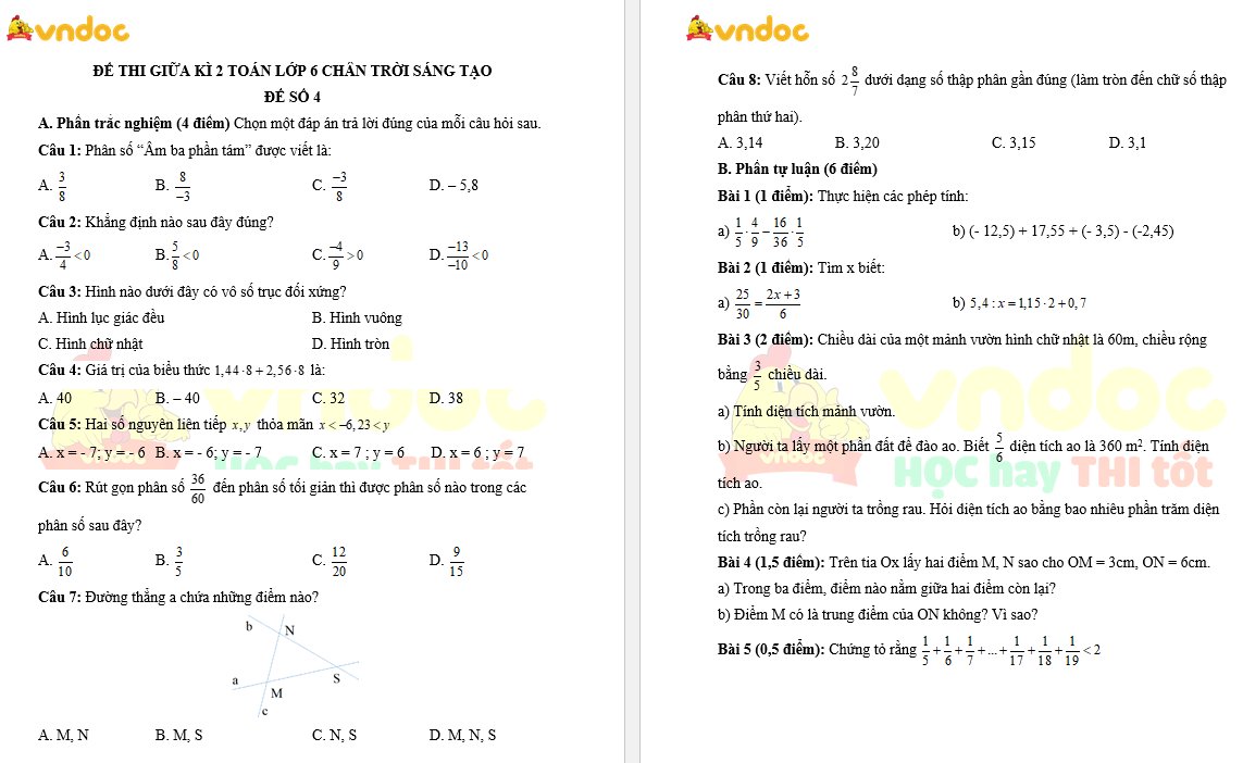 Bộ đề kiểm tra giữa kì 2 Toán 6 sách Chân trời sáng tạo năm 2023 - 2024 bao gồm 5 đề thi khác nhau do VnDoc biên soạn, có đầy đủ đáp án cho các em tham khảo luyện tập. Đề thi dưới đây bám sát chương trình học có đáp án và bảng ma trận để các em học sinh cùng củng cố chuẩn bị cho bài thi giữa kì 2 lớp 6.