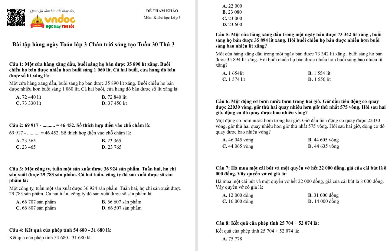 Bài tập hàng ngày Toán lớp 3 Cả năm
