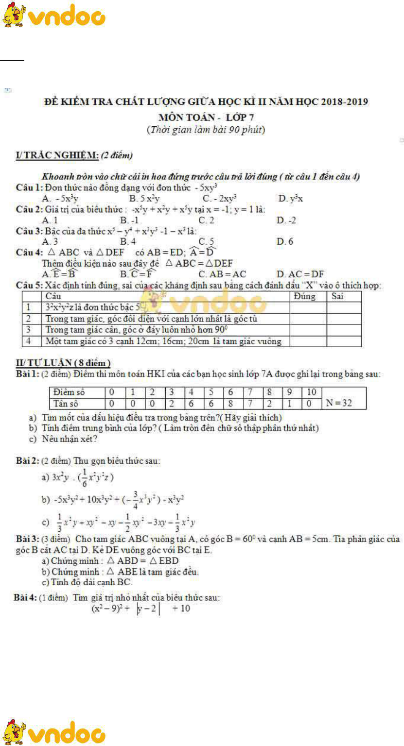 Bộ đề thi giữa học kì 2 lớp 7 môn Toán - Số 1 là đề kiểm tra giữa học kì 2 môn Toán lớp 7 dành cho các bạn học sinh lớp 7 tham khảo. Đề thi giữa học kì 2 lớp 7 môn Toán này sẽ giúp các bạn chuẩn bị tốt cho kì thi cuối học kì 2 sắp tới nói chung và ôn thi kiểm tra cuối học kì 2 môn Toán lớp 7 nói riêng. Mời các bạn và thầy cô tham khảo. Chúc các bạn đạt điểm cao trong các kì thi quan trọng sắp tới.