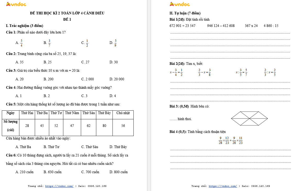 1. Đề thi Toán cuối kì 2 lớp 4 sách Cánh Diều