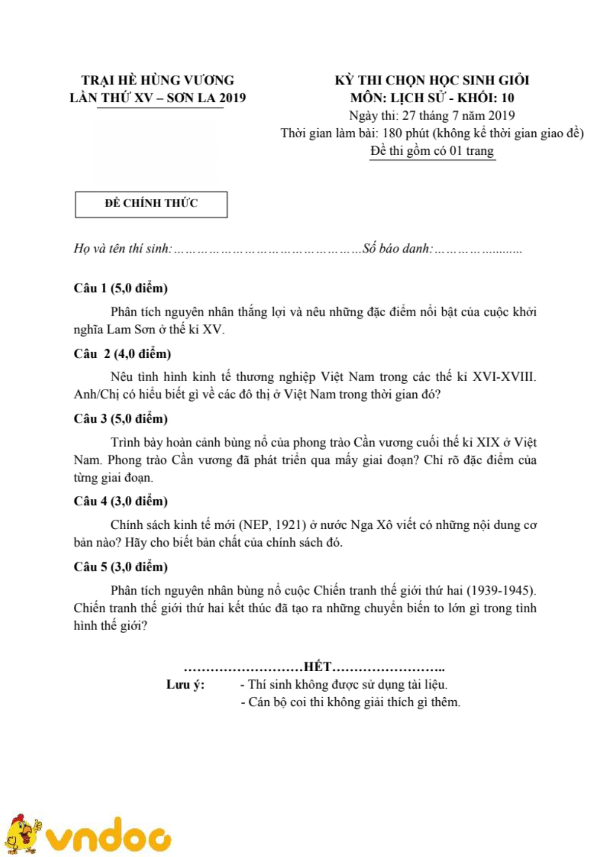VnDoc xin giới thiệu Bộ đề thi học sinh giỏi lớp 10 môn Lịch sử được sưu tầm và đăng tải gửi tới bạn đọc cùng tham khảo. Bài viết được tổng hợp từ đề thi của các tỉnh trong cả nước. Đề thi nhằm chọn ra những học sinh có năng lực học tập xuất sắc môn Lịch sử. Hãy tham khảo để ngày càng học tập tốt hơn.