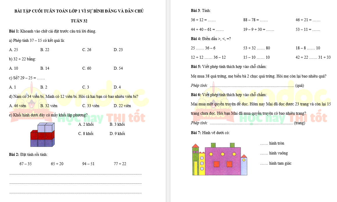 Bộ Phiếu bài tập cuối tuần Toán lớp 1 Vì sự bình đẳng và dân chủ (Học kì 2)