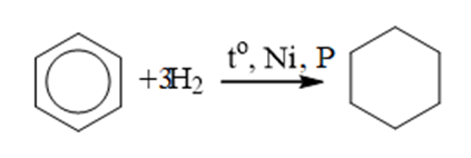 Phản ứng cộng hydrogen vào benzene tạo thành cyclohexane. Phản ứng xảy ra ở điều kiện áp suất cao và nhiệt độ cao, với sự có mặt của các chất xúc tác dị thể như platinum, nickel.