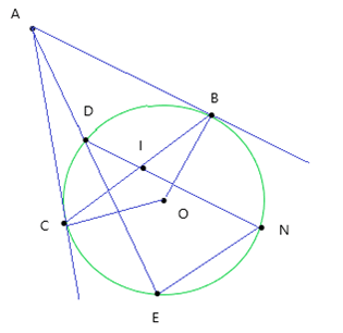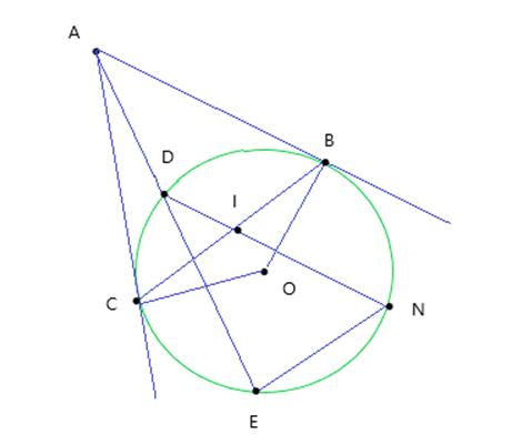 Bài 1: Từ điểm A nằm ngoài đường tròn O, kẻ tiếp tuyến AB, AC và cát tuyến ADE. Dây cung EN song song với BC. I là giao điểm của DN và BC. Chứng minh rằng IB = IC.