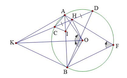 + Từ điểm K nằm ngoài đường tròn ta kẻ các tiếp tuyến KA, KB cát tuyến KCD, H là trung điểm CD thì năm điểm K, A, H, O, B nằm trên một đường tròn.