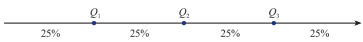 \(Q_1,Q_2,Q_3\) chia dãy dữ liệu đã sắp xếp theo thứ tự không giảm thành bốn phần, mỗi phần đều chứa 25% giá tri được gọi là các tứ phân vị.