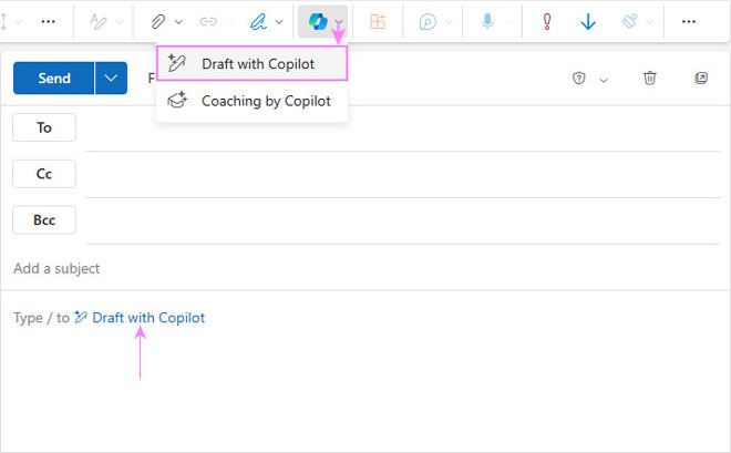 Bước 2: Trong phần nội dung email, nhấn vào liên kết Draft with Copilot hoặc chọn biểu tượng Copilot > Chọn Draft with Copilot.