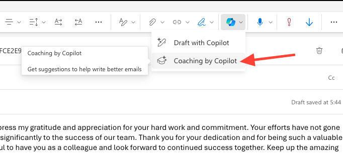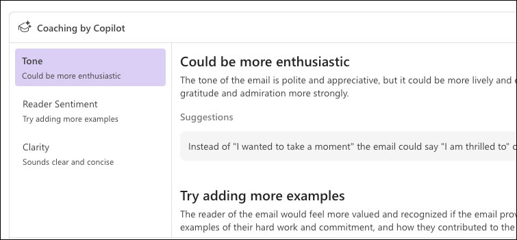Copilot trong Outlook có thể phân tích email để đề xuất cách cải thiện giọng văn trong email sắp gửi.