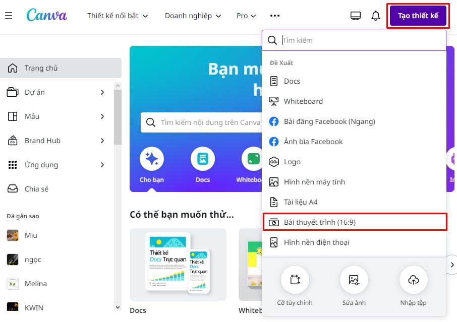 Nhấn chọn Thuyết trình, Canva sẽ đề xuất cho bạn 4 lựa chọn:
