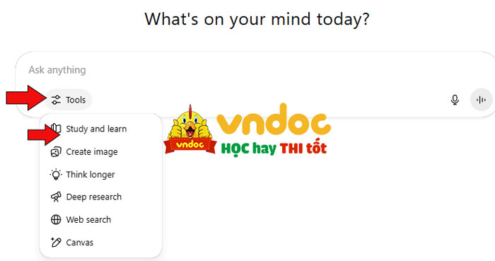Bước 2: Khi bạn cần sự hỗ trợ của ChatGPT với chế độ “Học tập” -> Hãy Click nút ‘Công cụ” / “Tool” tại cửa sổ nhập thông tin của ChatGPT và chọn nút “Học tập” / “Study & learn” hoặc “Học hỏi” rồi đặt câu hỏi / yêu cầu với nội dung cần được hỗ trợ.