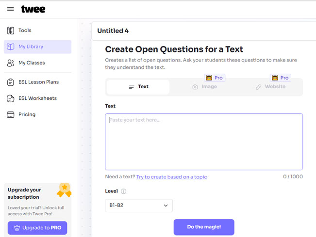 Bài viết này sẽ hướng dẫn bạn từng bước sử dụng Twee AI để tạo câu hỏi từ đoạn văn một cách hiệu quả, từ khâu nhập văn bản đến chỉnh sửa và xuất bản bài tập. Với khả năng phân tích ngữ nghĩa thông minh, Twee có thể sinh ra nhiều loại câu hỏi như trắc nghiệm, đúng/sai, hoặc câu hỏi mở – đồng thời cho phép tùy chỉnh mức độ khó theo chuẩn CEFR từ A1 đến C2 giúp giáo viên dễ dàng xây dựng tài liệu học tập phù hợp với trình độ của từng nhóm học sinh.