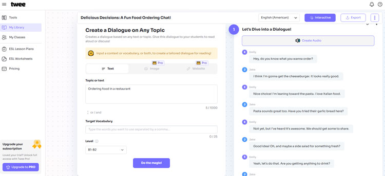 Nhấn nút “Do the magic!” hoặc “Generate”, Twee nhanh chóng tạo một đoạn hội thoại tự nhiên và sư phạm, phù hợp vai trò người nói A và B trong lớp học.