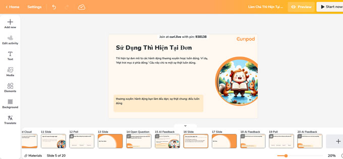 Bước 8: Người dùng có thể chỉnh sửa lại slide nếu cần, có thể thêm câu hỏi, hình ảnh, trò chơi vào slide để tăng tính tương tác. Để xem trước, bấm Preview.