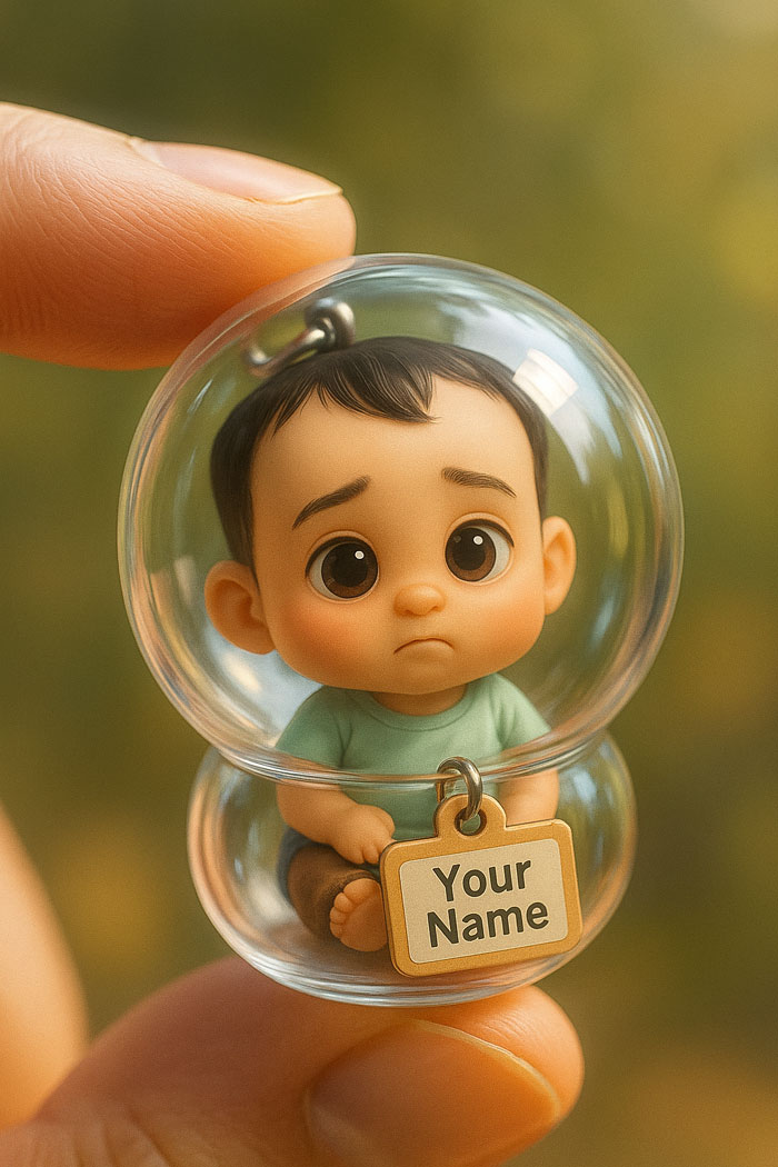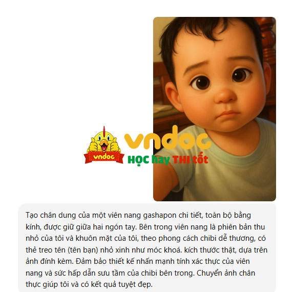 Prompt 1: Tạo chân dung của một viên nang gashapon chi tiết, toàn bộ bằng kính, được giữ giữa hai ngón tay. Bên trong viên nang là phiên bản thu nhỏ của tôi và khuôn mặt của tôi, theo phong cách chibi dễ thương, có thẻ treo tên (tên bạn) nhỏ xinh như móc khoá. kích thước thật, dựa trên ảnh đính kèm. Đảm bảo thiết kế nhấn mạnh tính xác thực của viên nang và sức hấp dẫn sưu tầm của chibi bên trong. Chuyển ảnh chân thực giúp tôi và có kết quả tuyệt đẹp.