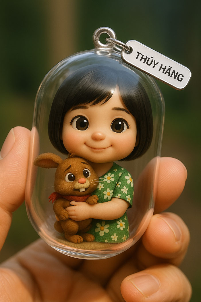 Prompt 4: “Tạo hình viên nang gashapon bằng kính trong suốt, có móc nhỏ phía trên, đang được giữ giữa hai ngón tay. Bên trong là một cô giáo chibi người Việt với tóc buộc thấp, mặc áo sơ mi hồng nhạt và quần đen, gương mặt tươi cười rạng rỡ. Bên cạnh hộp có móc khoá treo tên “Thảo” như vật trang trí. Phong cách dễ thương, chi tiết cao, tỉ lệ như thật.”