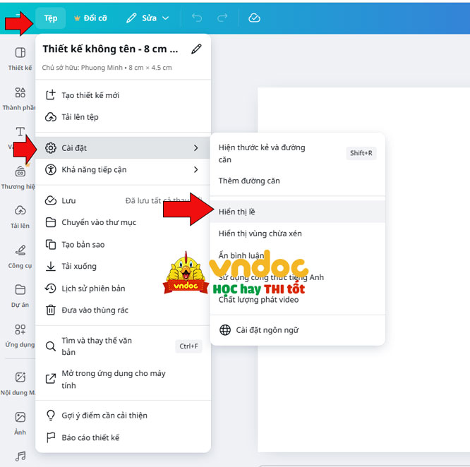 Bước 3: Kích vào Tệp -> Cài đặt -> hiển thị lề.