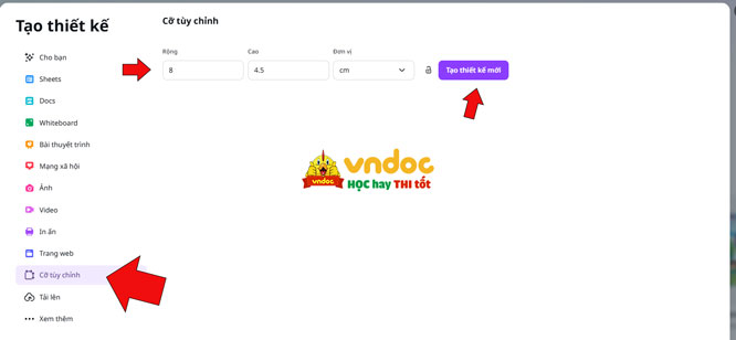 Bước 2: Kích vào nút Tạo -> Cỡ tùy chỉnh -> điều chỉnh kích thước rộng 8, cao 4.5, đơn vị cm -> Tạo thiết kế mới.