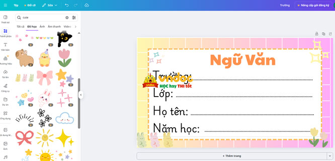 Bước 13: Kích vào Thành phần -> gõ từ khóa Cute vào ô tìm kiếm để thêm những hình ảnh nhỏ xinh, dễ thương vào góc nhãn vở.