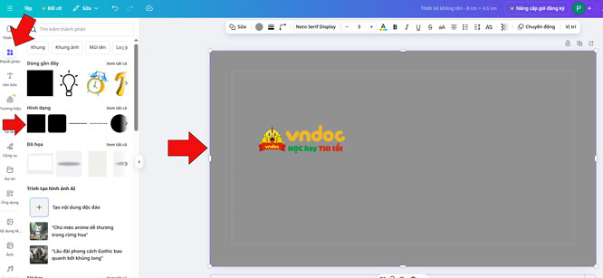 Bước 4: Kích vào nút thành phần, ở phần hình dạng, chọn hình vuông đầu tiên. Sau đó điều chỉnh hình vuông, kéo nó full với kích thước ở bên khung thiết kế.