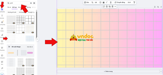 Bước 6: Kích vào Thành phần -> ở ô tìm kiếm gõ từ khóa grid -> Chọn một khung lưới và điều chỉnh kích thước cho full màn hình thiết kế.