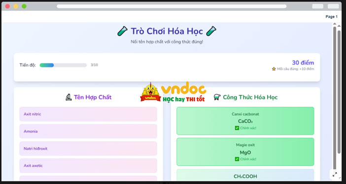 Hãy tạo một trò chơi tương tác về nối tên hợp chất với công thức hóa học đúng dành cho học sinh trung học phổ thông. Nội dung chơi gồm 10 câu hỏi kéo thả, học sinh nối tên hợp chất như “Axit sunfuric” với công thức tương ứng H₂SO₄. Chủ đề và giao diện màu sắc khoa học, có emoji để tạo không khí học tập. Có hiệu ứng kéo thả, âm thanh phản hồi khi đúng/sai, chúc mừng hoàn thành. Font chữ tiếng Việt, tròn, dễ đọc. Có tiến độ và hệ thống tính điểm.