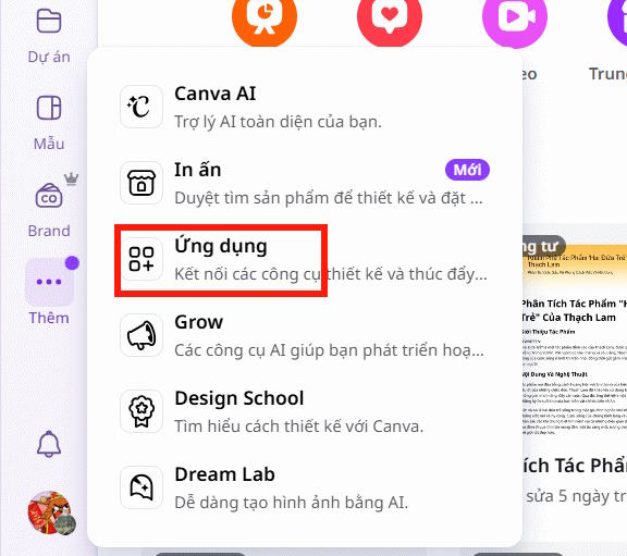 Truy cập Canva AI, tại giao diện chính chọn biểu tượng ba chấm (⋯) rồi nhấn vào mục Ứng dụng.