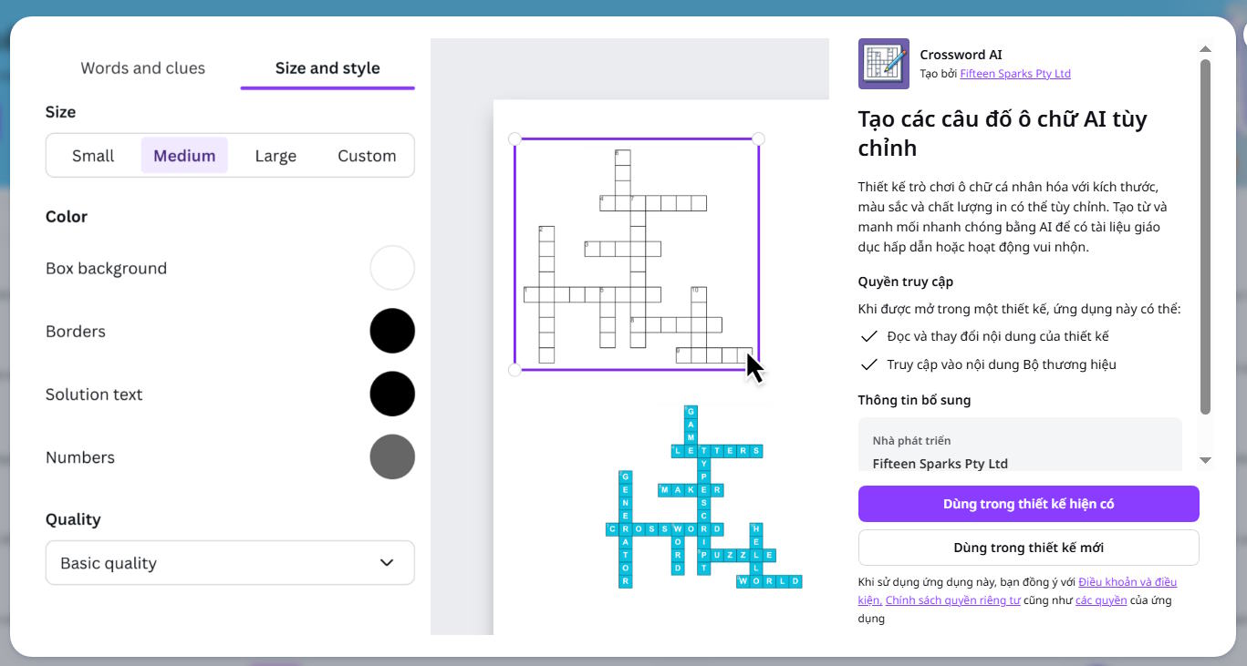 Không cần biết lập trình hay kỹ thuật phức tạp, thầy cô vẫn có thể dễ dàng thiết kế trò chơi ô chữ nhờ công cụ Crossword AI tích hợp trong Canva AI. Ứng dụng này hỗ trợ tạo game ô chữ tự động dựa trên nội dung mà người dùng cung cấp, giúp tiết kiệm thời gian mà vẫn đảm bảo tính sinh động và hấp dẫn cho bài học.
