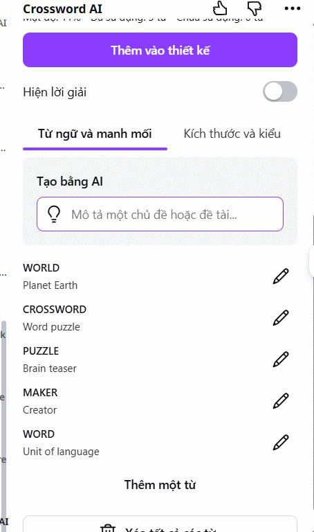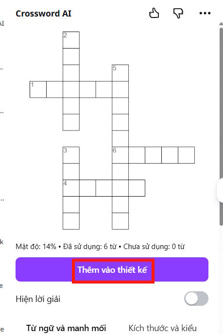 Ngay lập tức, Canva AI sẽ tự động tạo bộ từ và sắp xếp thành ô chữ theo hàng ngang, hàng dọc kèm gợi ý.