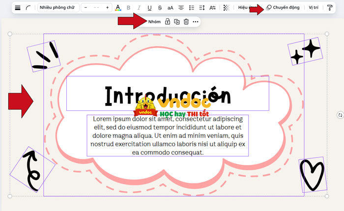 Kích vào trang bạn muốn tạo hiệu ứng, kéo chuột toàn bộ trang -> kích vào Nhóm -> kích vào chuyển động.
