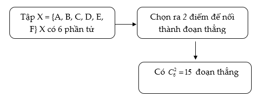 Ví dụ 1. Cho hình lục giác ABCDEF, hãy tìm một đoạn thẳng mà điểm đầu và điểm cuối chọn từ các đỉnh A, B, C, D, E, F và hãy tính xem có bao nhiêu đoạn thẳng như vậy.