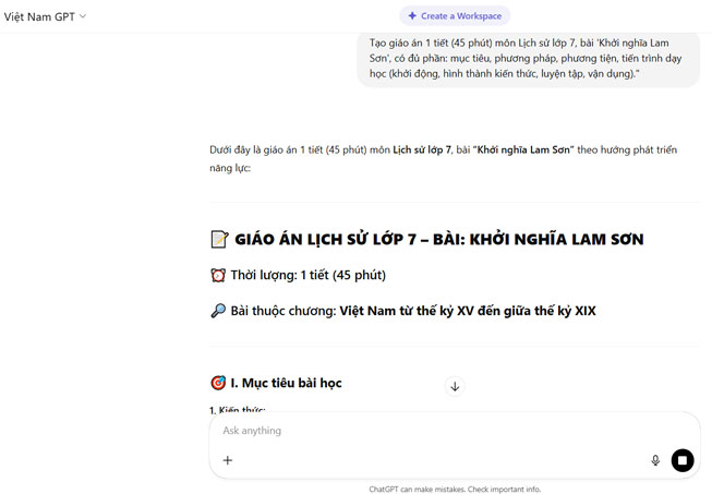 ChatGPT không thay thế người soạn, mà là công cụ hỗ trợ tăng tốc. Vì vậy, sau khi ChatGPT tạo giáo án theo yêu cầu, bạn cần đọc lại, điều chỉnh cho phù hợp với thực tế lớp học, SGK và chuẩn kiến thức của Bộ GD&ĐT.