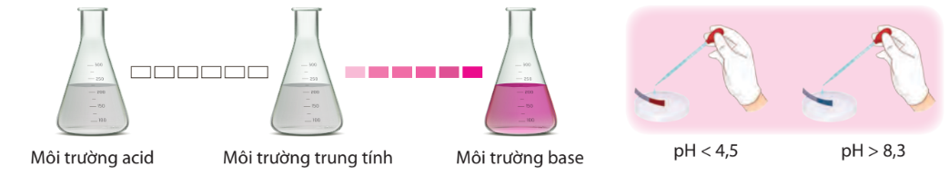 - Sự thay đổi màu trong các môi trường đối với giấy pH (a), dung dịch phenolphthalein (b), giấy quỳ tím (c):