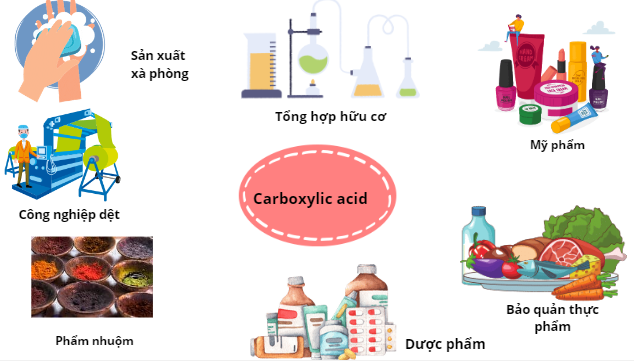 Carboxylic acid có nhiều ứng dụng trong các lĩnh vực như: thực phẩm, dược phẩm, mỹ phẩm, y tế, phẩm nhuộm, tổng hợp hữu cơ,…