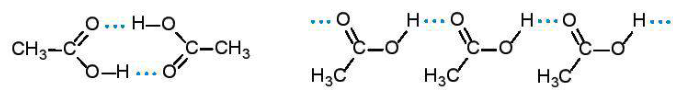 Phân tử carboxylic acid chứa nhóm carboxyl phân cực. Các phân tử carboxyl acid liên kết hydrogen với nhau tạo thành dạng dimer hoặc dạng liên phân tử: