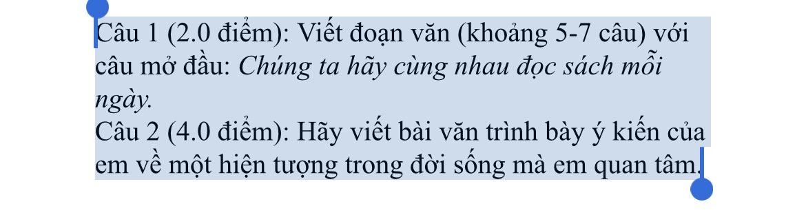 Câu 2 (4.0 điểm): Hãy viết bài văn trình bày ý kiến của em về một hiện tượng trong đời sống mà em quan tâm.