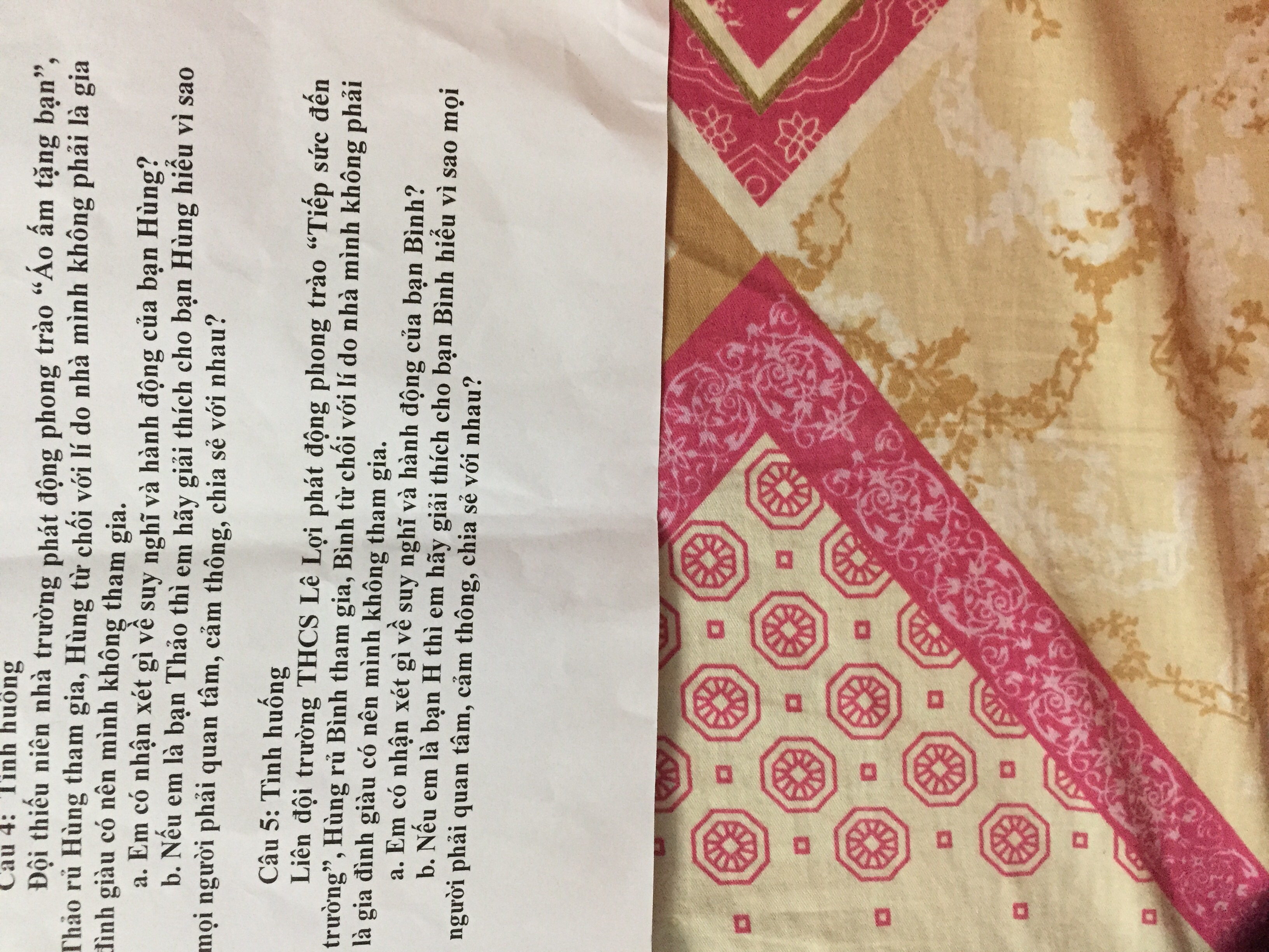 Câu 4: Đội Thiếu niên nhà trường phát động phong trào áo ấm tặng bạn Thảo rủ Hùng tham gia, Hùng từ chối vừa lý do nhà mình không phải là gia đình giàu có nên mình không tham gia