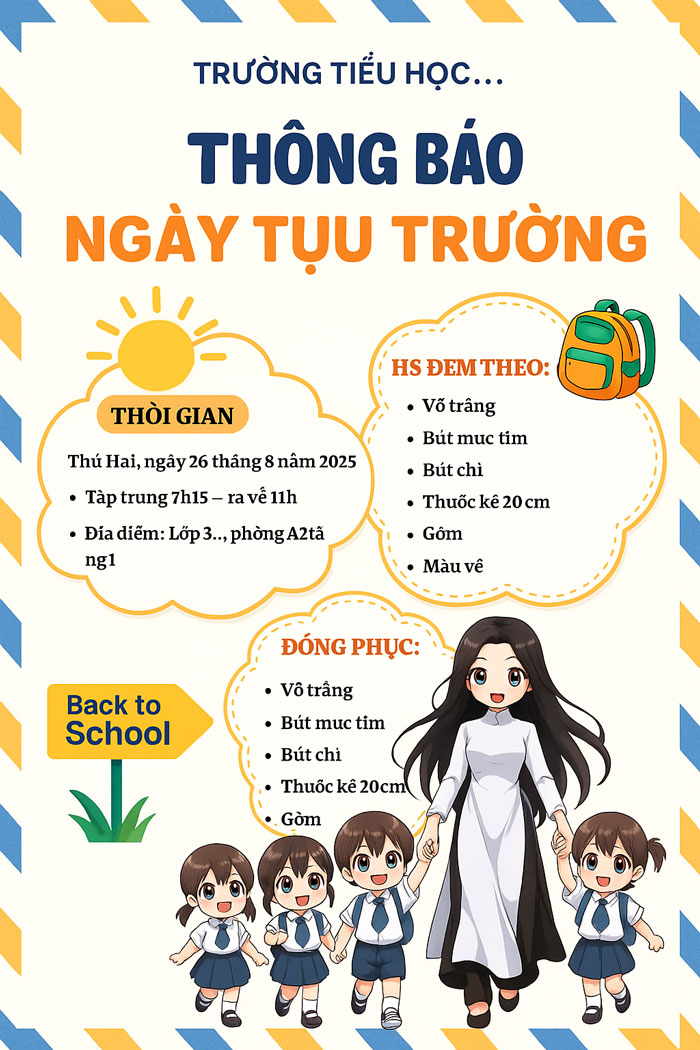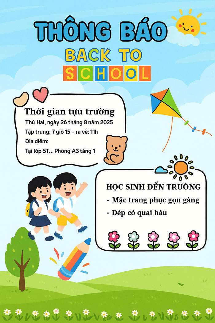 Một thông báo tựu trường, khai giảng năm học mới bắt mắt, dễ thương không chỉ giúp truyền tải thông tin rõ ràng mà còn tạo sự hứng khởi cho các em nhỏ. Năm học mới đang đến gần, và thầy cô chắc hẳn đang chuẩn bị những bước đầu tiên để chào đón học sinh quay trở lại trường. Trong bài viết này, thầy cô sẽ tìm thấy câu lệnh thiết kế poster thông báo tựu trường, khai giảng năm học mới cực kỳ đơn giản mà hiệu quả, tất cả đều sẵn sàng để thầy cô áp dụng ngay cho lớp mình.