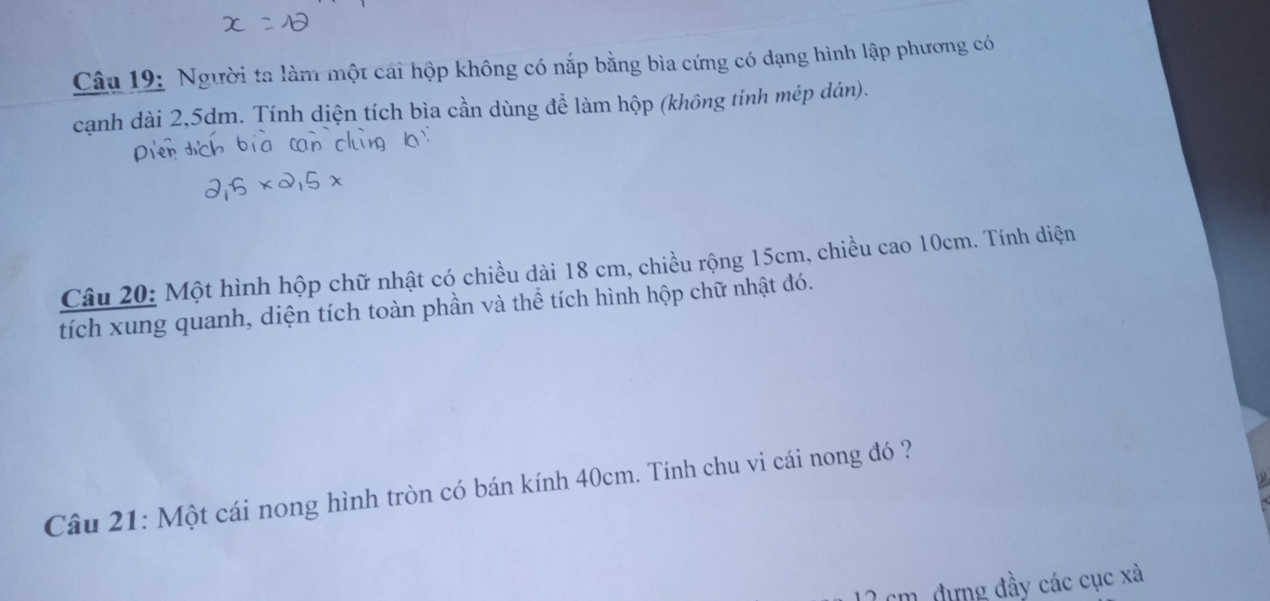 Một hình hộp chữ nhật có chiều dài 18cm, chiều rộng 15cm, chiều cao 10cm
